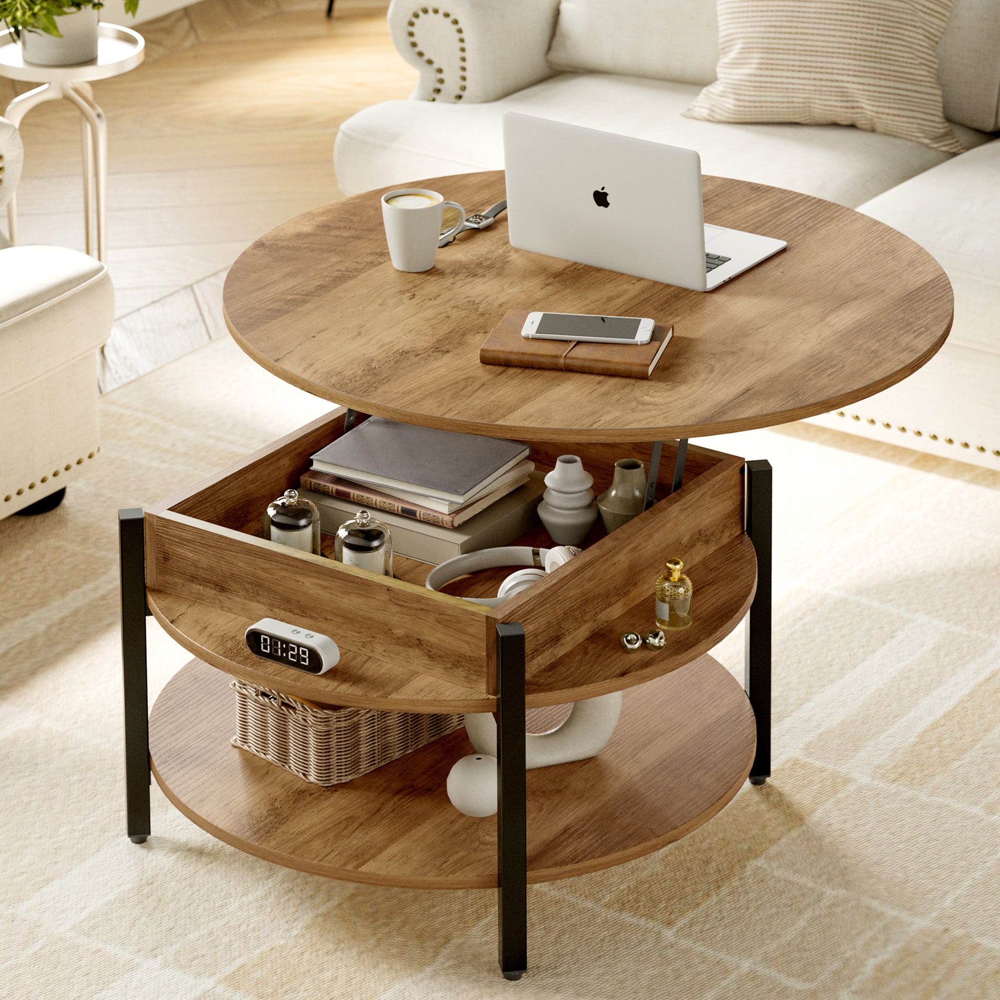 DOVEAID Round Lift Top Small Coffee Table with Storage Modern Farmhouse Center Table with Shelf Small Circle Table for Living Room,Light brown
